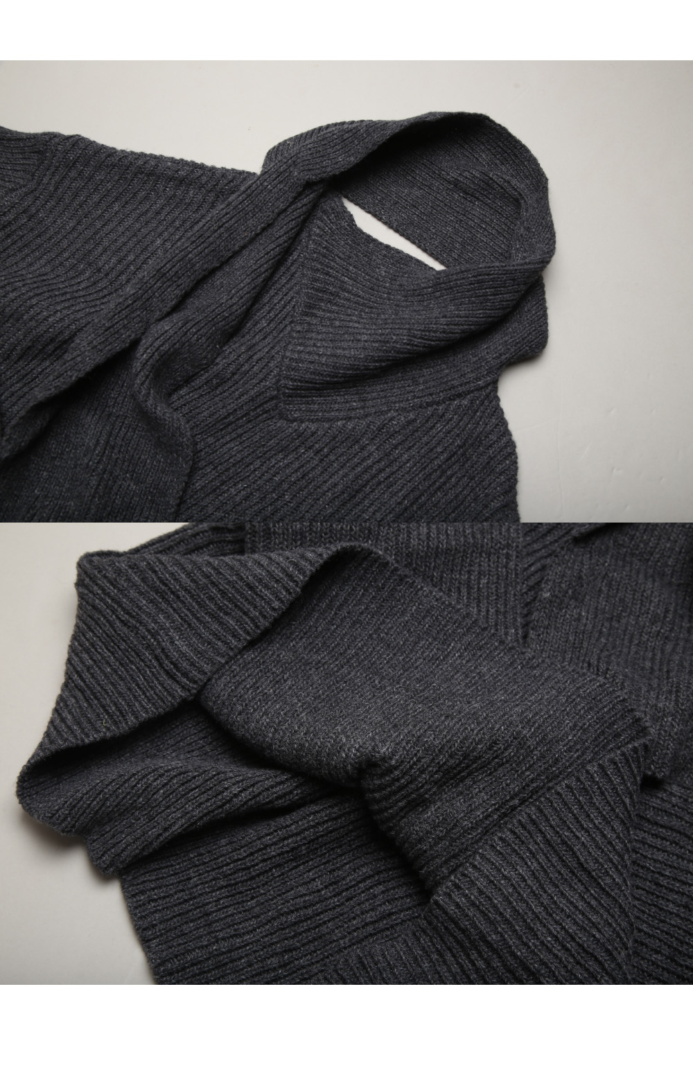 두께감 있는 세로 골지 짜임이라 목 주변이