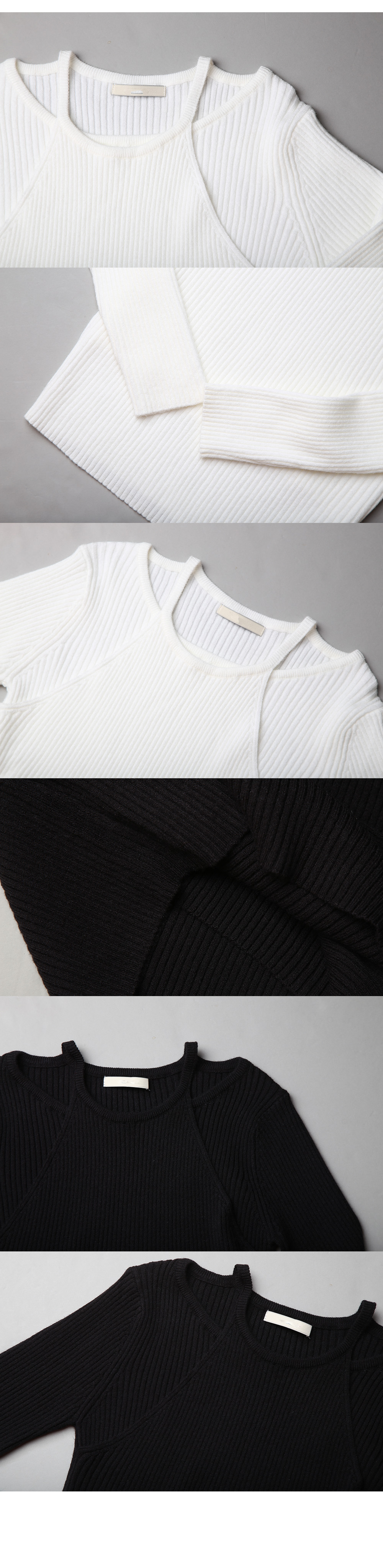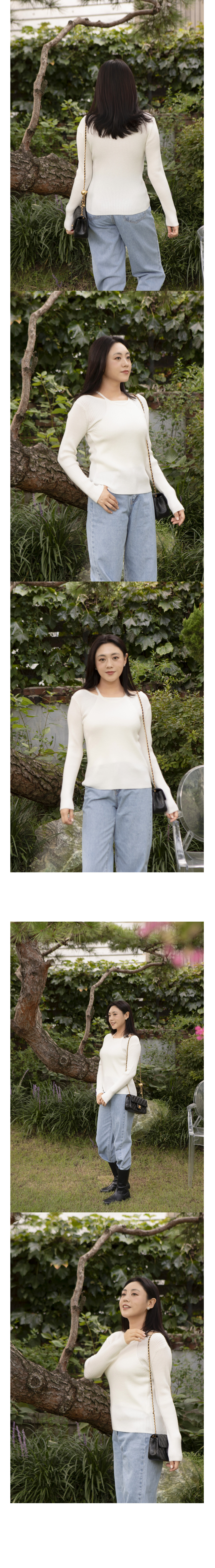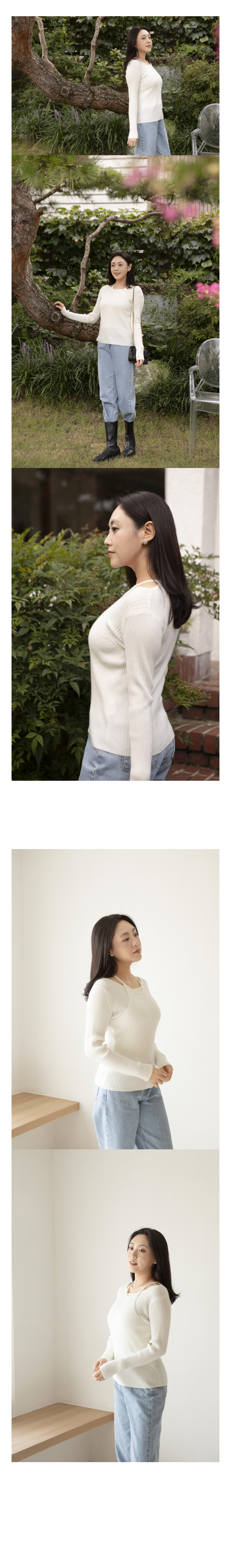 레이어드 넥의 사선과 세로 리브의 직선이 만나