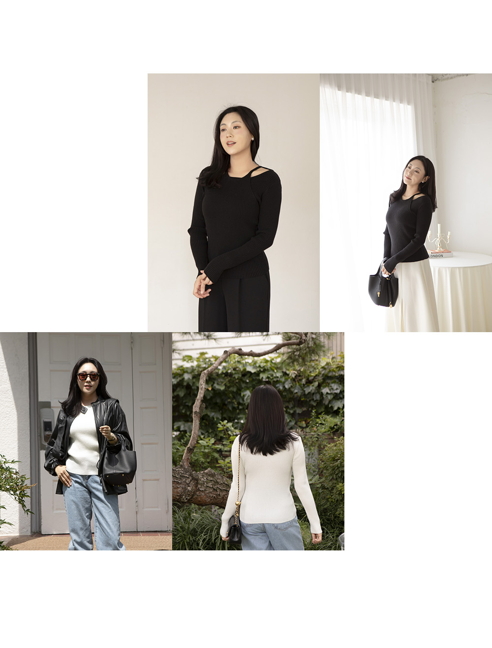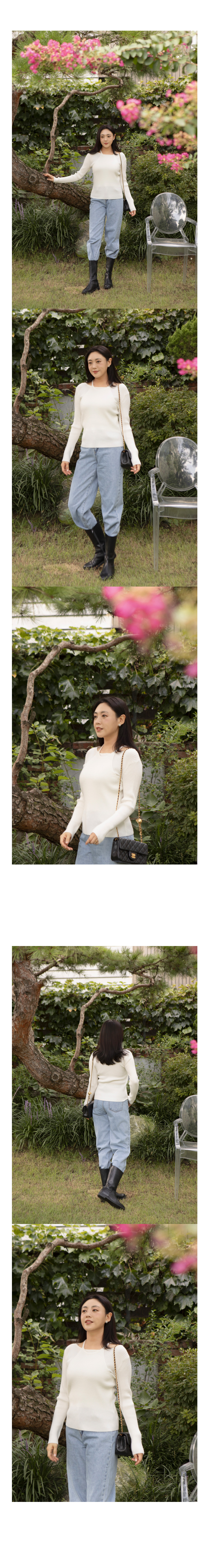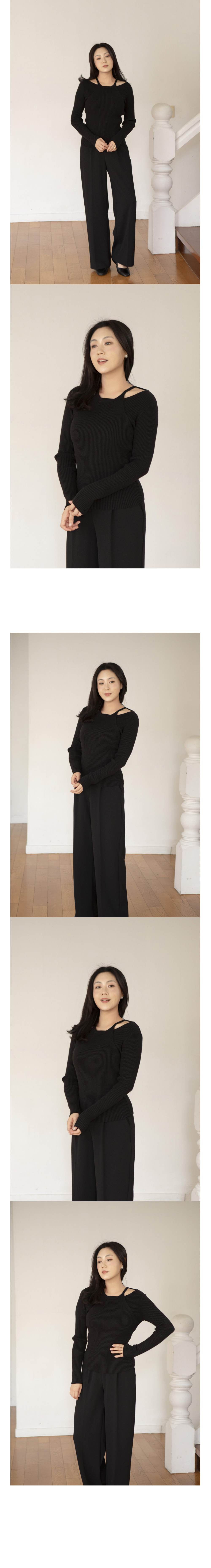 레이어드 넥의 사선과 세로 리브의 직선이 만나